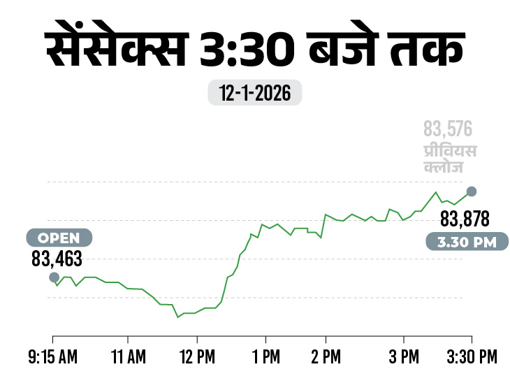 सेंसेक्स में गिरावट, निफ्टी में गिरावट, 12 जनवरी 2026 को बाजार गिरावट के साथ खुला | सेंसेक्स 302 अंक बढ़कर 83,878 पर बंद हुआ। ऊर्जा और धातु शेयरों में खरीदारी से निफ्टी 107 अंक चढ़ा।
