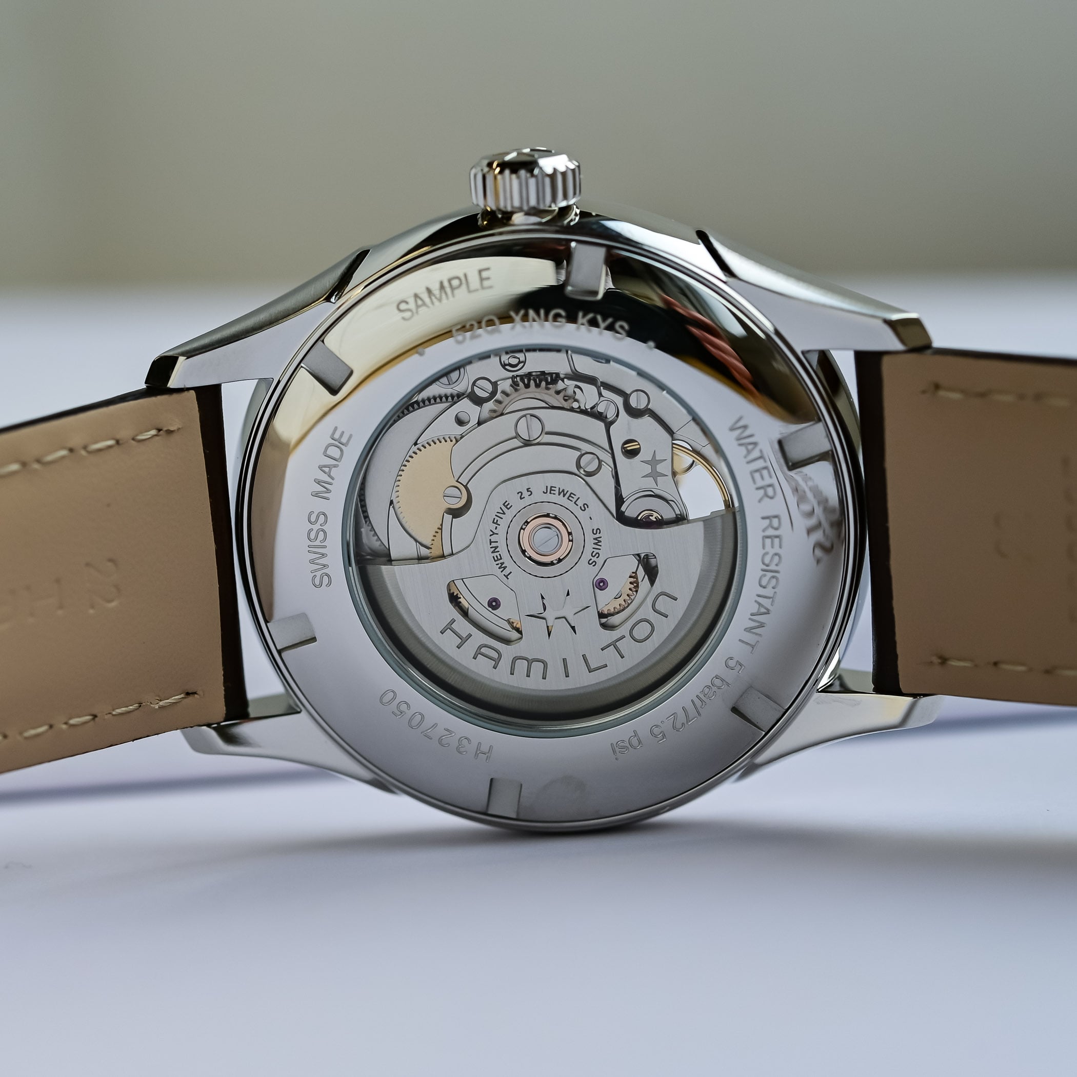 Powering all Jazzmaster Open Heart models is Hamilton’s H-10 automatic movement (powermatic 80), based on ETA C07.111, which itself is ETA 2824. Operating at 21,600 vibrations per hour, it has an 80-hour power reserve and is designed for reliability and everyday use. The Nivachron hairspring has enhanced resistance to magnetism, temperature changes and shocks. The exhibition case back offers a view of the movement, which has been finished in an industrial and honest manner to match the position of the watch.
