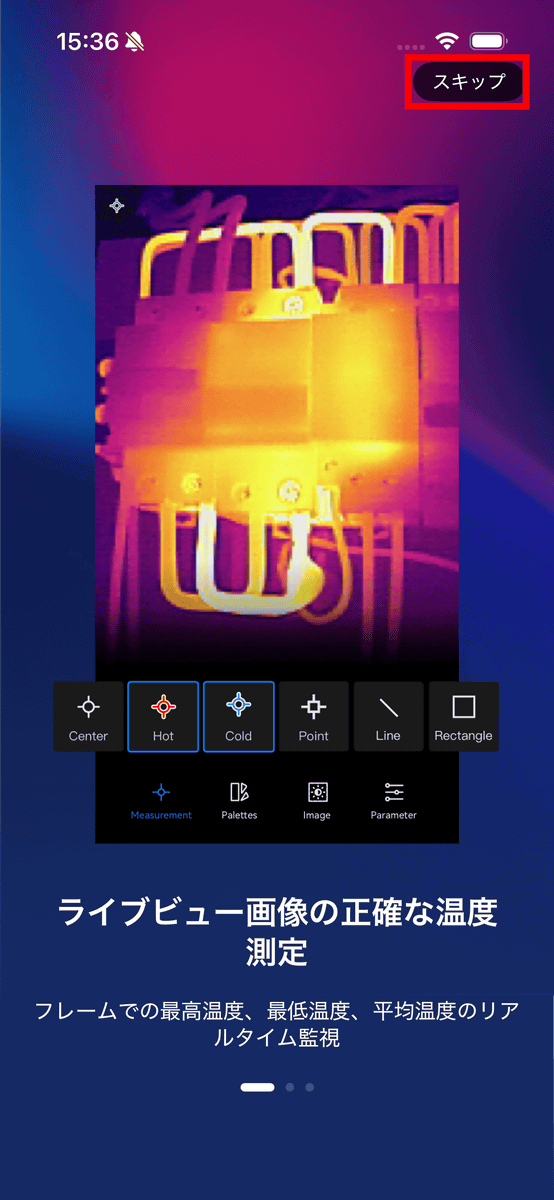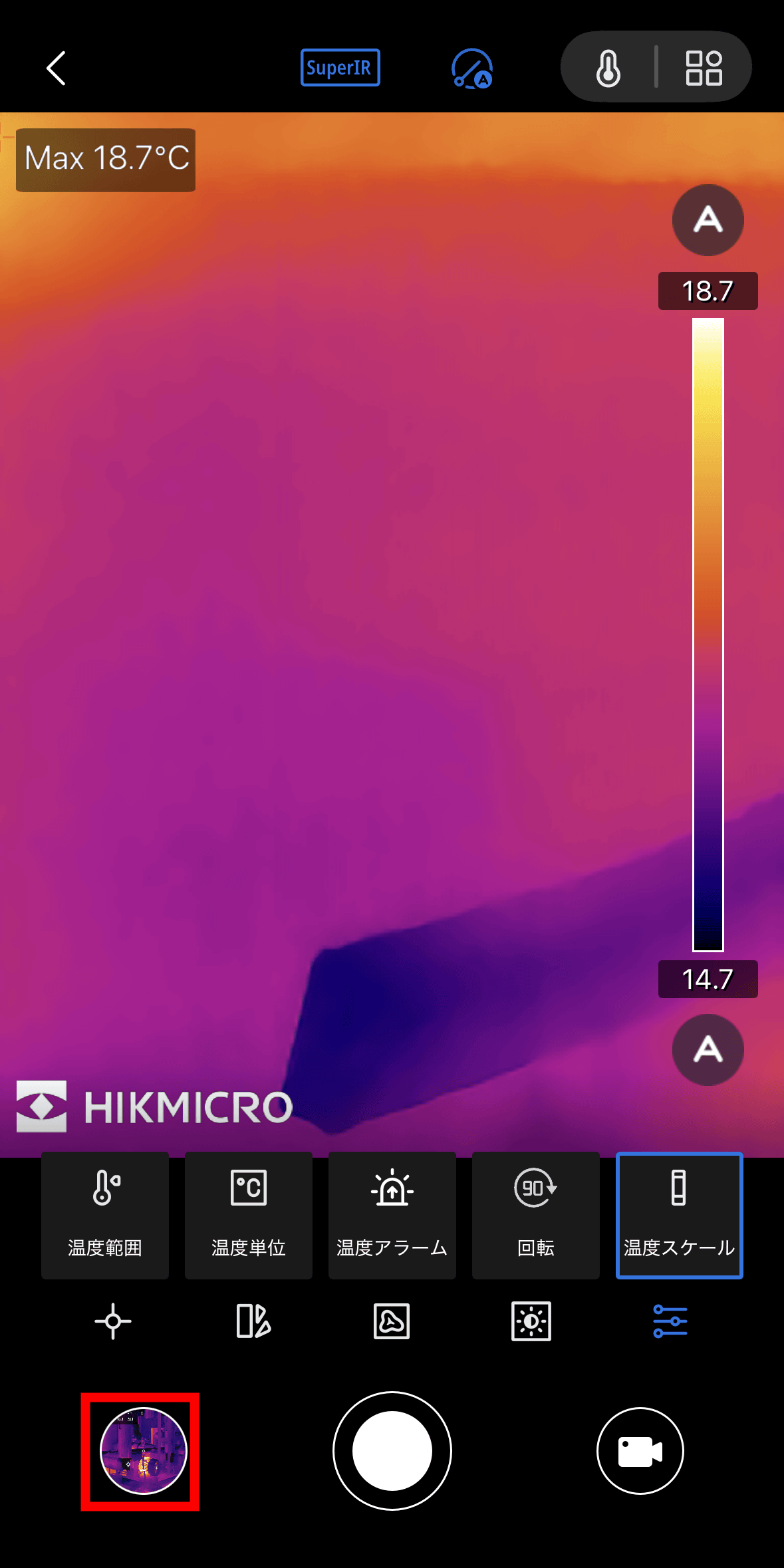With the rightmost icon, you can set the “temperature range”, the “temperature unit” that determines degrees Celsius, degrees Fahrenheit, and Kelvin, the “temperature alarm” that sounds an alarm when a certain temperature is detected, the “rotation” that rotates the camera screen in 90 degree increments, and the “temperature scale” that continues to show or hide the temperature scale displayed on the right side of the screen.