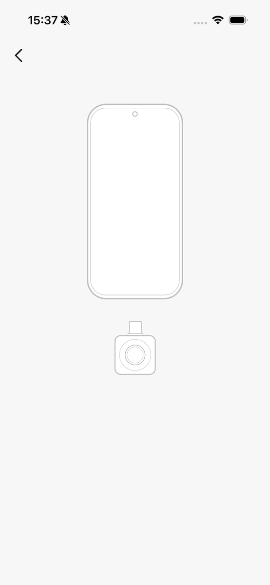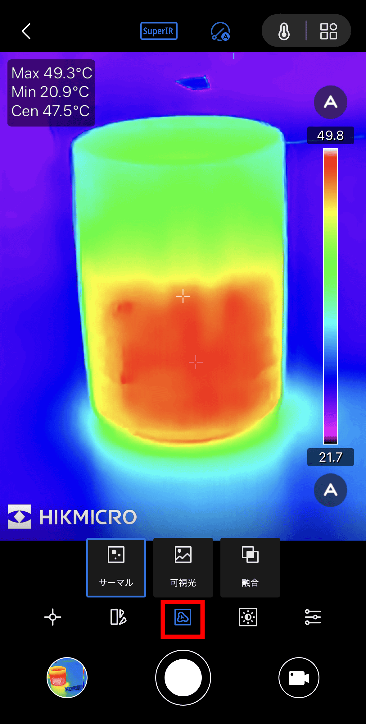 You can change the camera image by tapping the icon in the center. You can choose from three options: “Thermal”, which displays only thermal images, “Momentary Light”, which displays images taken with a smartphone camera simultaneously, and “Fusion”, which combines the two.