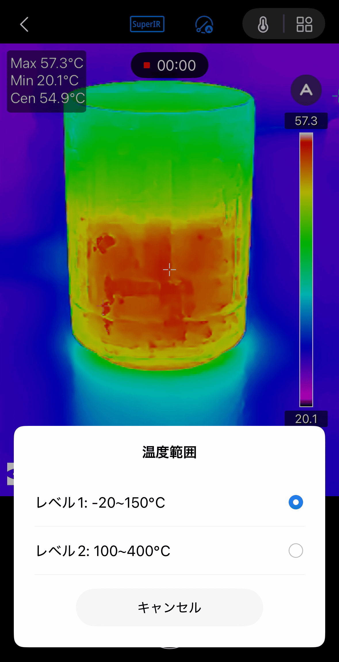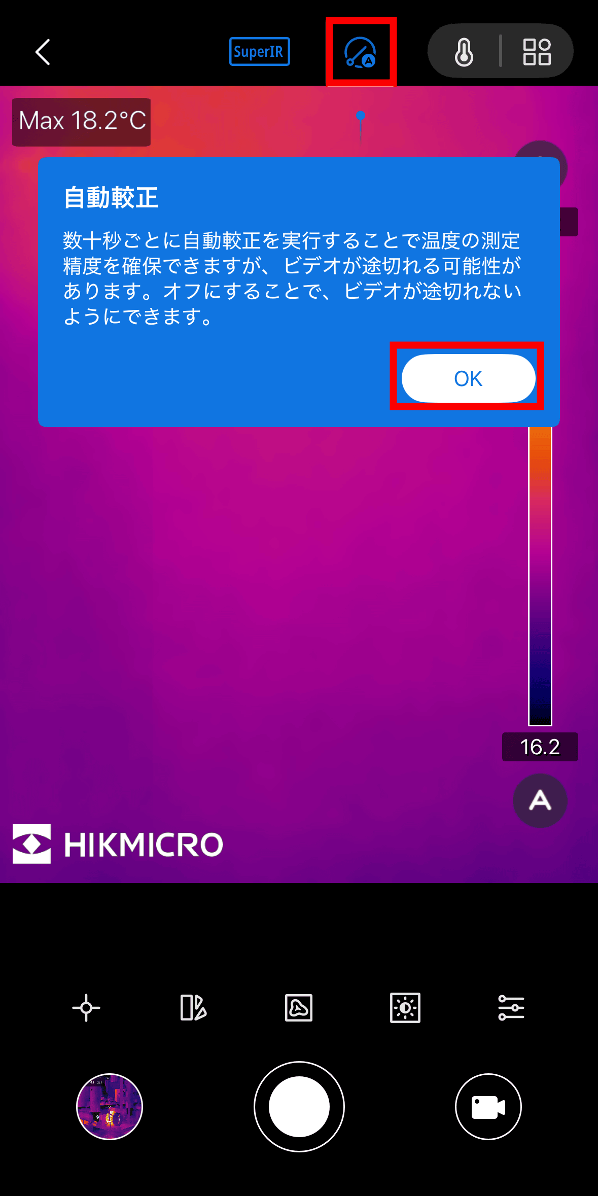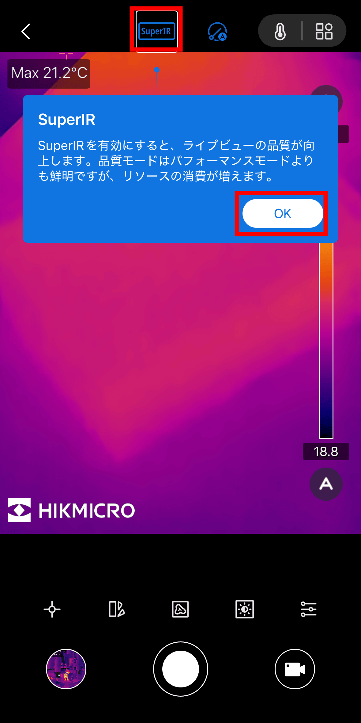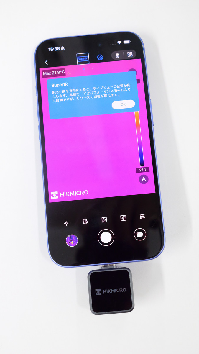 When you start the application with the Mini2Plus V2 main unit connected to your smartphone, it looks like this. When starting for the first time, an explanation of SuperIR, which is a high quality mode, will be displayed, so tap “OK”.