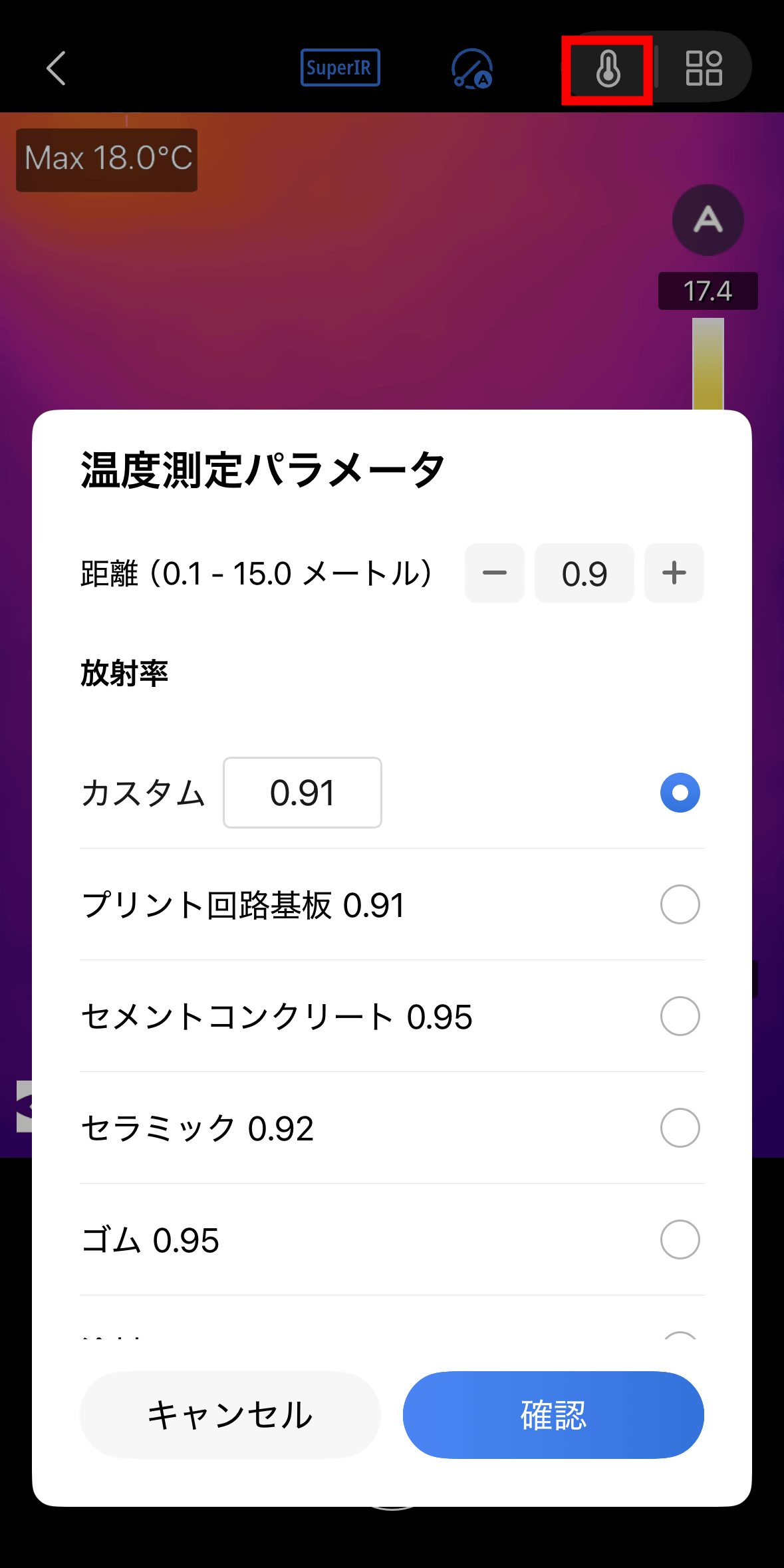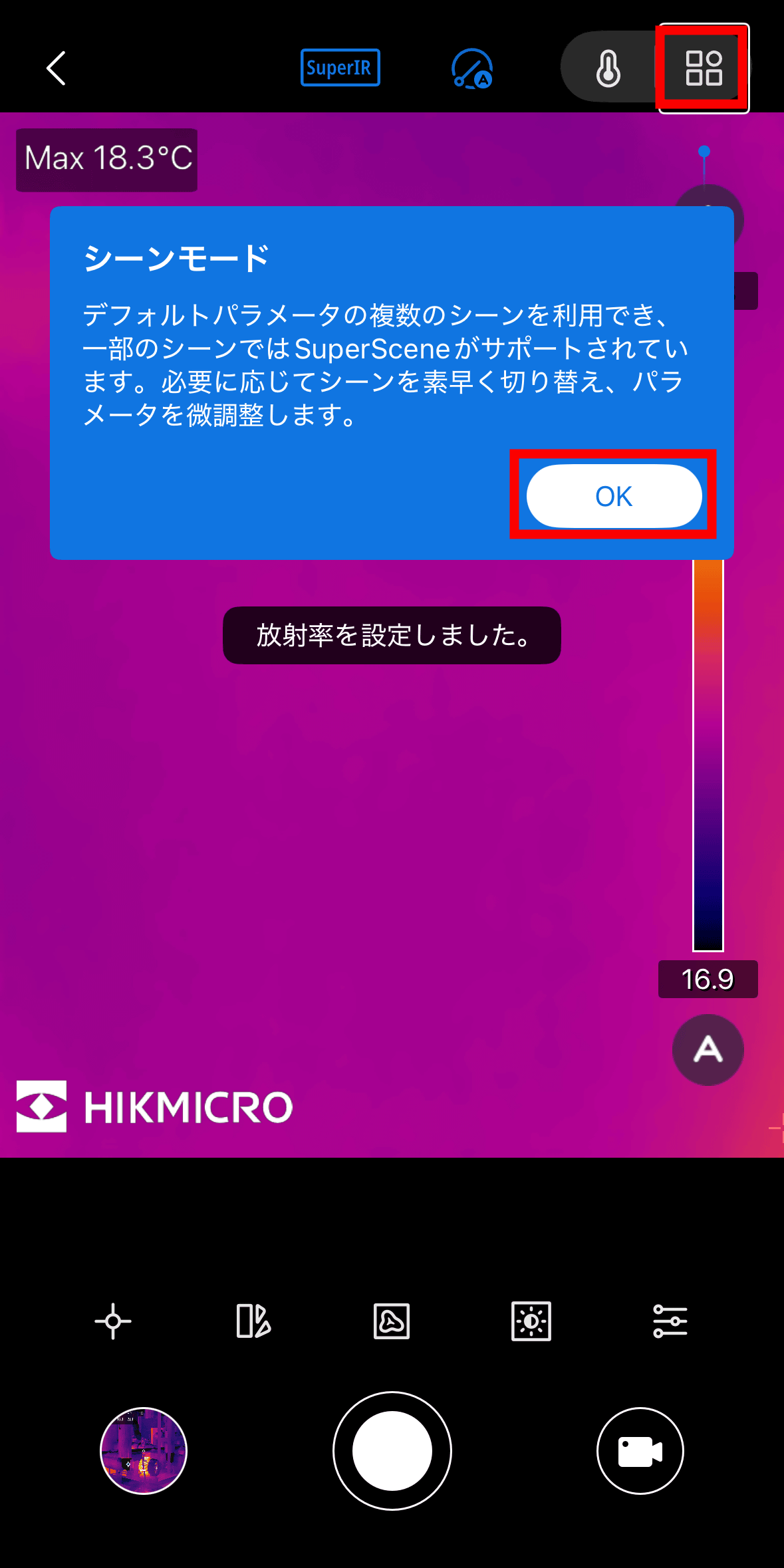 “Scene mode” is a mode that enables more accurate temperature measurement by setting the emissivity of the target in advance. Tap OK.