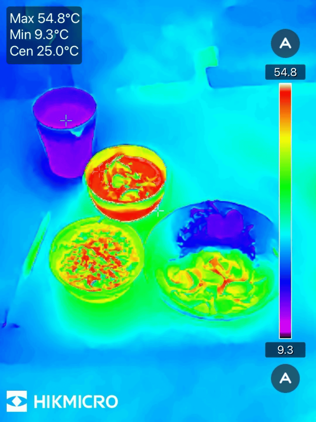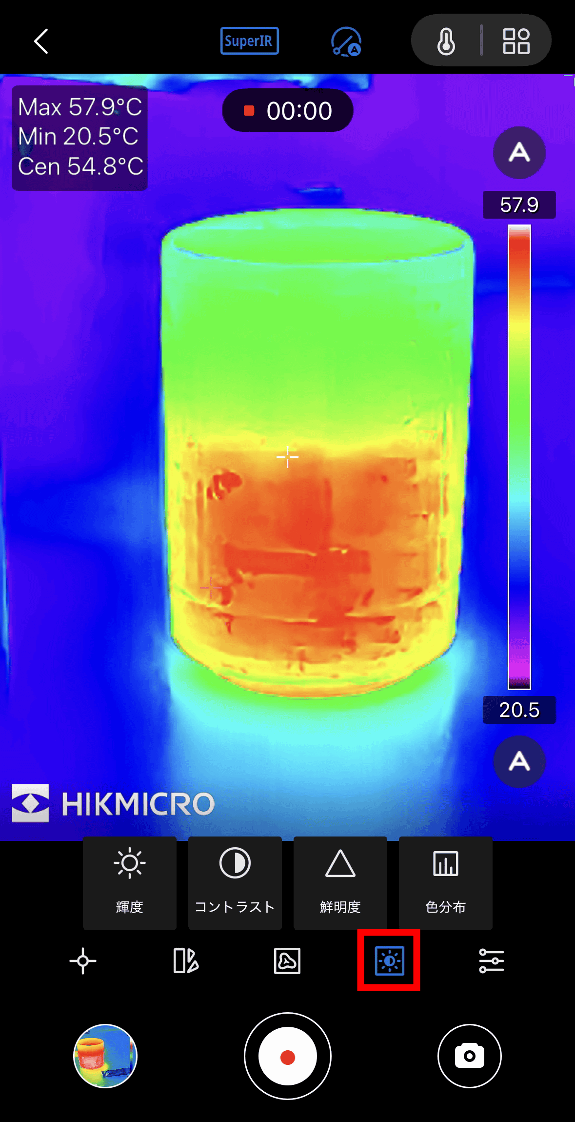 Numerical measurements are possible at “Center (center of screen),” “Maximum (Temperature),” and “Minimum (Temperature).” The measured temperature can be selected by tapping the icon on the far left at the bottom of the screen, and the value will be displayed at the top left of the screen.
