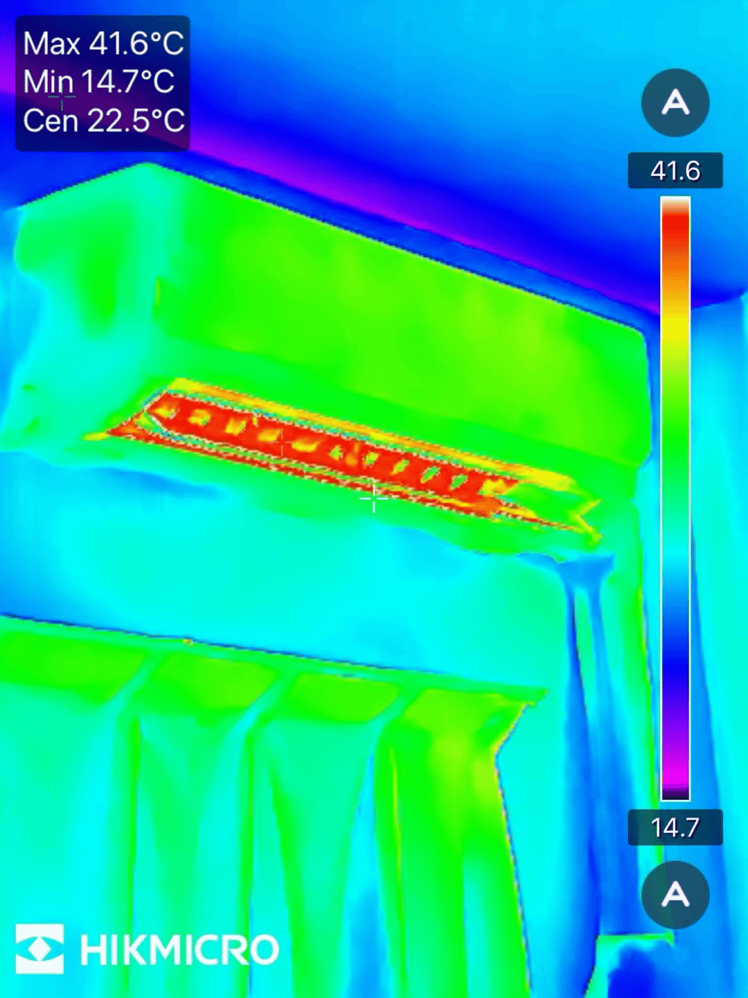 A photo of the air conditioner with the heating function turned on in the morning. You can see that the temperature at the air outlet is particularly high, and the surrounding walls are lower than the air conditioner itself and the curtains.