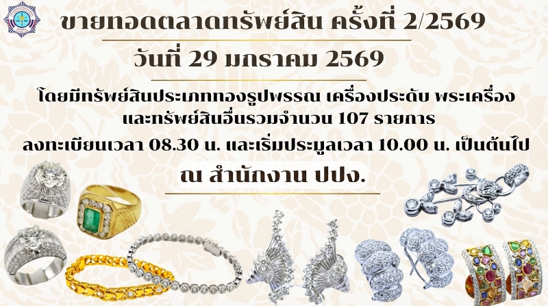 สำนักงานปปง. จะทำการขายทอดตลาดทรัพย์สิ 2/2569 ซึ่งเป็นทรัพย์สินประเภทอัญมณี 107 29 29 มกราคม 2569 ลงทะเบียนตั้งแต่เวลา 08.30น. 10.30 น. 101 101 101 101 101 101 101 101 101 101 สำนักงานปปง. โดยมีรายการทรัพย์สินที่น่าสนใจดังนี้