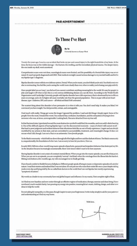Maanantina WSJ:ssä julkaistiin räppärin allekirjoittama anteeksipyyntö, joka on otsikoitu: “Niille, joita olen satuttanut”.