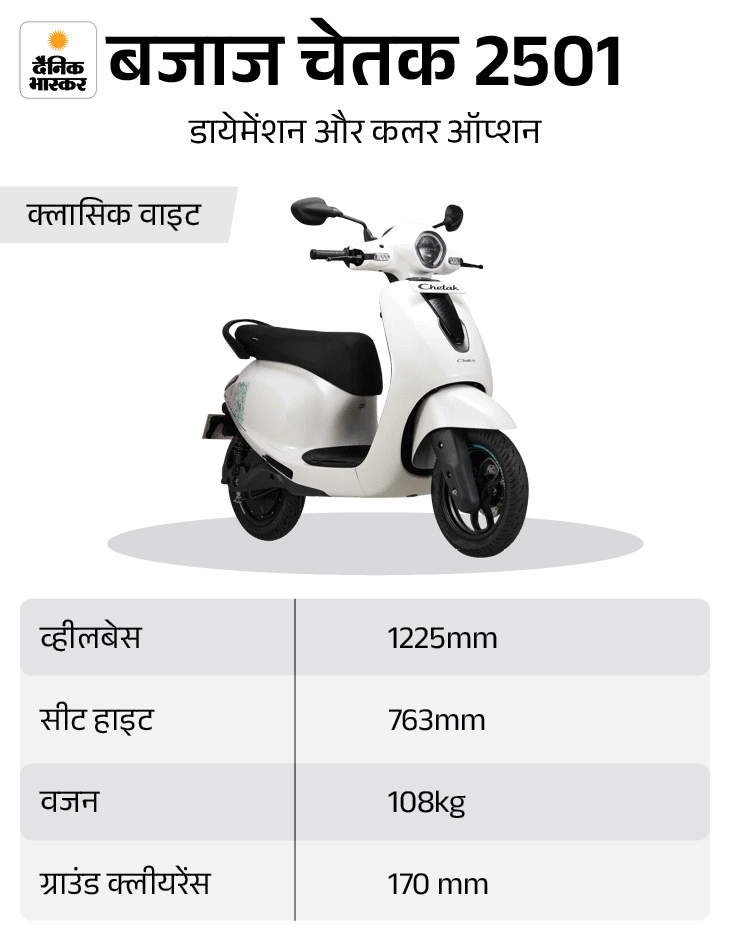 नए चेतक C2501 में बजाज के नए चेसिस फ्रेम का उपयोग किया गया है और बैटरी पैक फ़्लोरबोर्ड के नीचे स्थित है। इससे इलेक्ट्रिक स्कूटर को सीट के नीचे 25 लीटर की जगह मिलती है। कंपनी ने एक्स-शोरूम कीमत 91,399 रुपये अपरिवर्तित रखी है। प्री-ऑर्डर अब खुले हैं और आने वाले हफ्तों में शोरूम में उपलब्ध होंगे। भारत में इस इलेक्ट्रिक स्कूटर का मुकाबला TVS iQube और Ola S1 से होगा