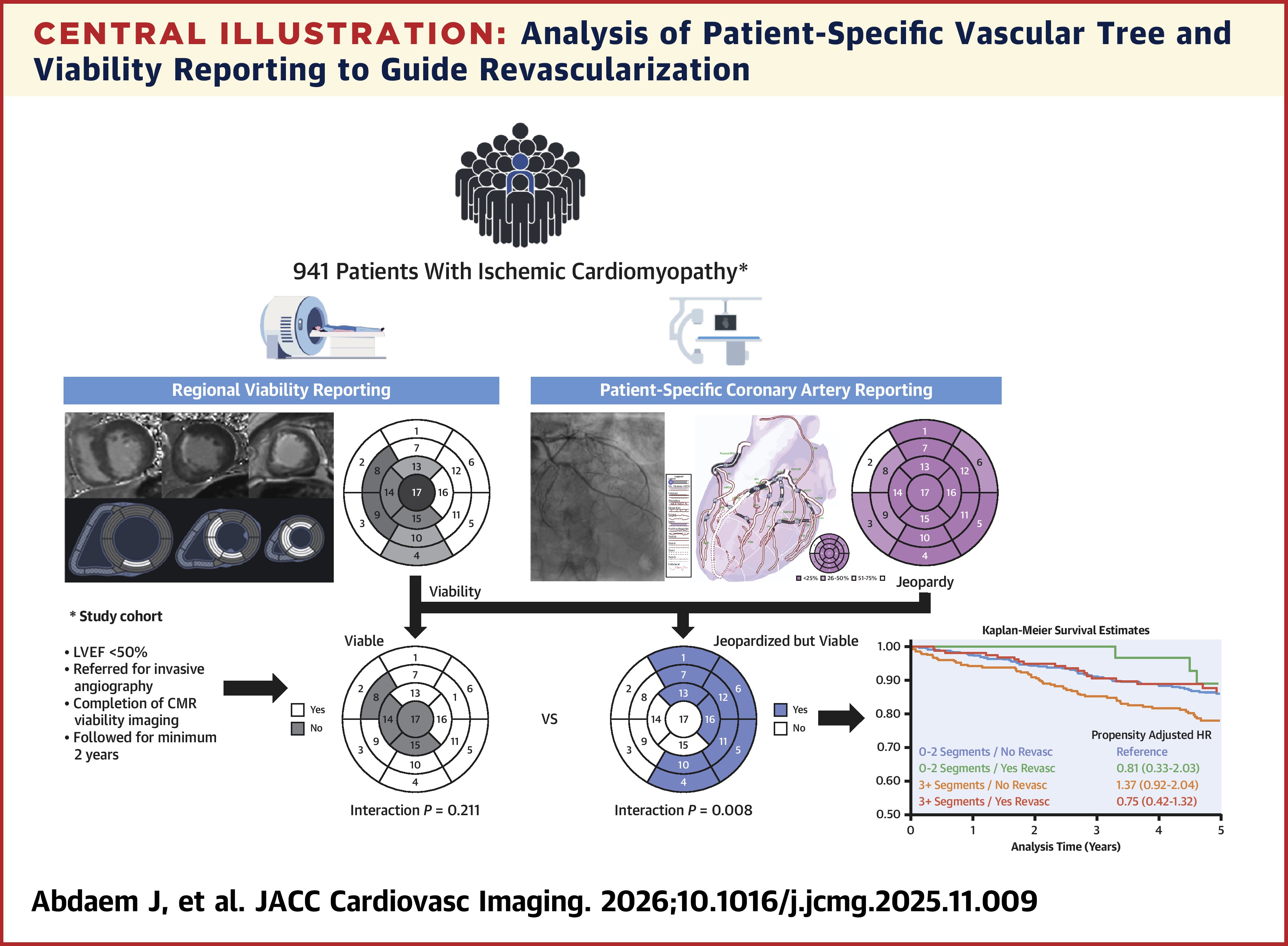 Dr. Jacob Abudayemstudied 941 patients with ICM (mean age 65 years, 81% male) who underwent cardiac magnetic resonance (CMR) and invasive coronary angiography between 2015 and 2022. The authors estimated the risk of segmental perfusion from the patient-specific vascular tree and determined the at-risk but viable segment by considering the segmental survival score.
