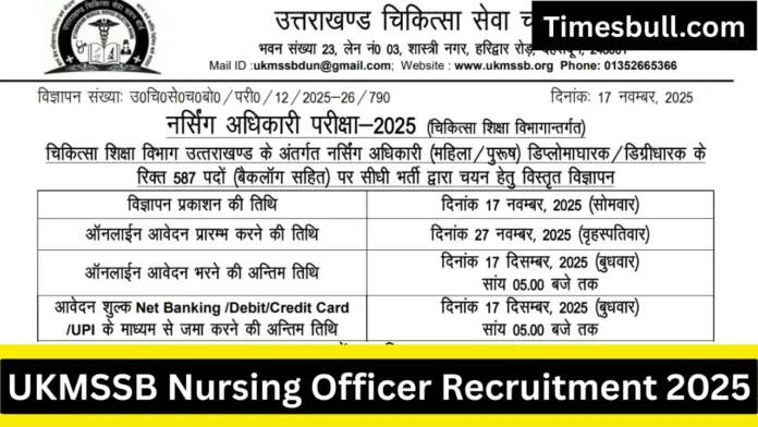 The Uttarakhand Medical Services Selection Board (UKMSSB) announced the recruitment of 587 Nursing Officers for medical colleges and the Haldwani Cancer Institute in Uttarakhand. Online applications open on November 27, 2025, and close on December 17, 2025. The recruitment offers positions for both male and female candidates with diplomas (336 female, 75 male) and degrees (32 male). Selected candidates will receive a Level-7 pay scale of ₹44,900 – ₹1,42,400 per month. Application is online through the UKMSSB website, www.ukmssb.org. This is a valuable opportunity for qualified nursing professionals seeking government jobs.