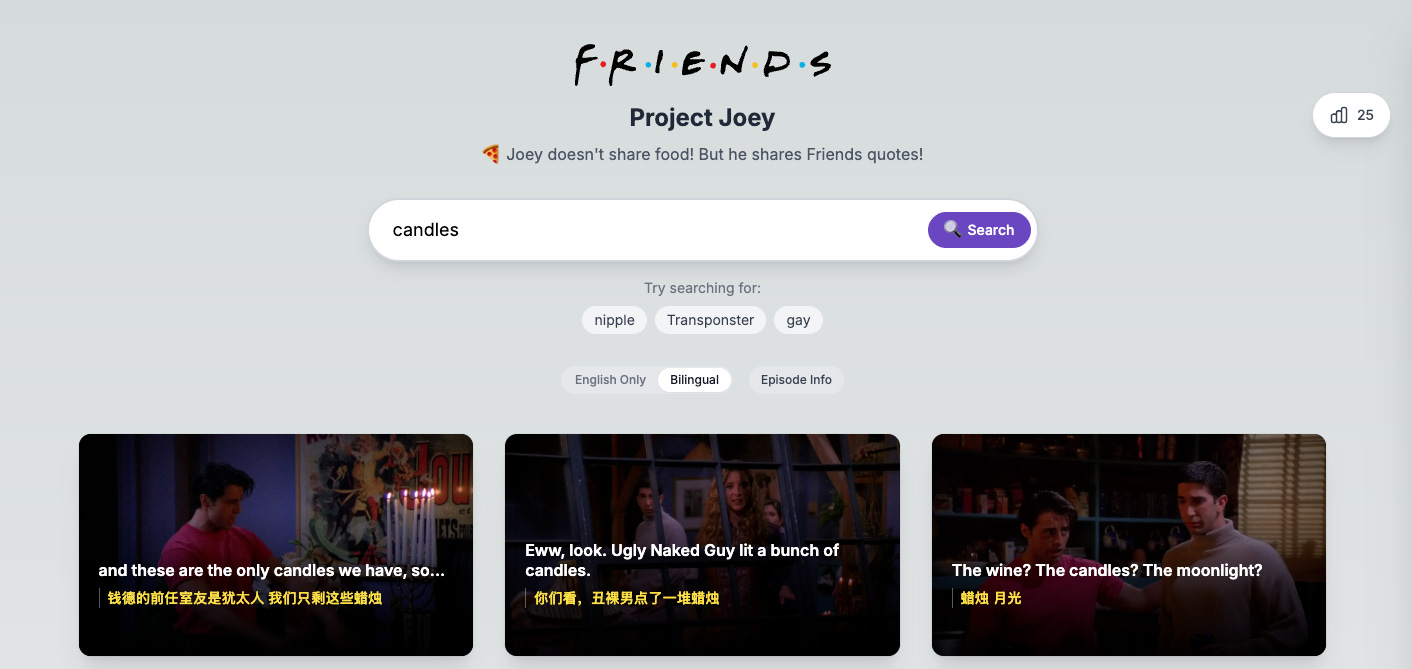 project joey: Find where, when, and how often a keyword appears across a sitcom series friend,In other words Extremely popular in China.